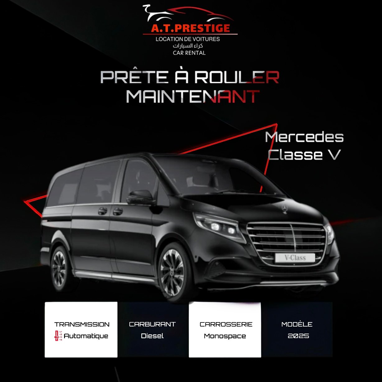 La Classe V redéfinit les standards du van de luxe. Destinée à ceux qui voyagent en groupe ou ont besoin d’un espace modulable exceptionnel, elle offre un confort digne d’un salon roulant. L’alliée idéale pour les transferts aéroport, les réunions d’équipe ou les voyages en famille, avec le prestige Mercedes.